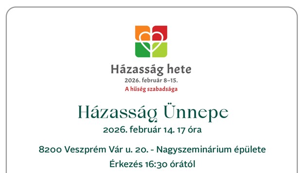 A Házasság Ünnepén 2026. február 14. napján 17 órai kezdettel szeretettel várjuk házaspárokat  Helyszín  8200 Veszprém Vár u. 20. - Nagyszeminárium épülete Érkezés 16:30 órától   Az est során a Borítékolható szerelem című előadásban Vallomásokat, levél részleteket…